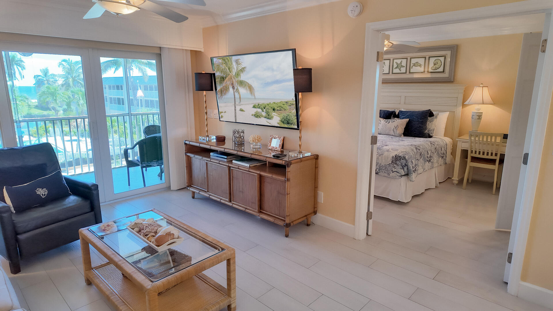 Sanibel Siesta on the Beach, Unit 108. GULF VIEW UNIT. COMPLETELY RENOVATED, UPDATED AND REFURNISHED! Beautiful 3rd floor 2BR/2BA with gulf view from living room, spacious lanai, master BR and kitchen. Sleeps 6 king, 2 twins, queen sleeper sofa and 2 rocker/swivel recliners. Master BR is private suite with full bath. 4 HD TVs with DVD players (1 Blu-Ray), CD stereo with iPod dock and free Wi-Fi. Very near elevator access and easy parking. Unit is beautifully appointed with Florida tropical furnishings and decor throughout AND is fully stocked and equipped! Both full baths feature grab bars and seated showers. Friendly on-site management and maintenance office. Ask about out special rates for extended stays at this lush tropical paradise.