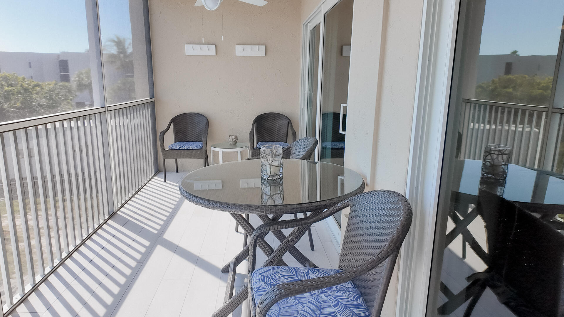 Screened porch/lanai is spacious, comfortably seats 6 and has 2 ceiling fans with lighting - overlooks lush tropical grounds and Gulf of Mexico.