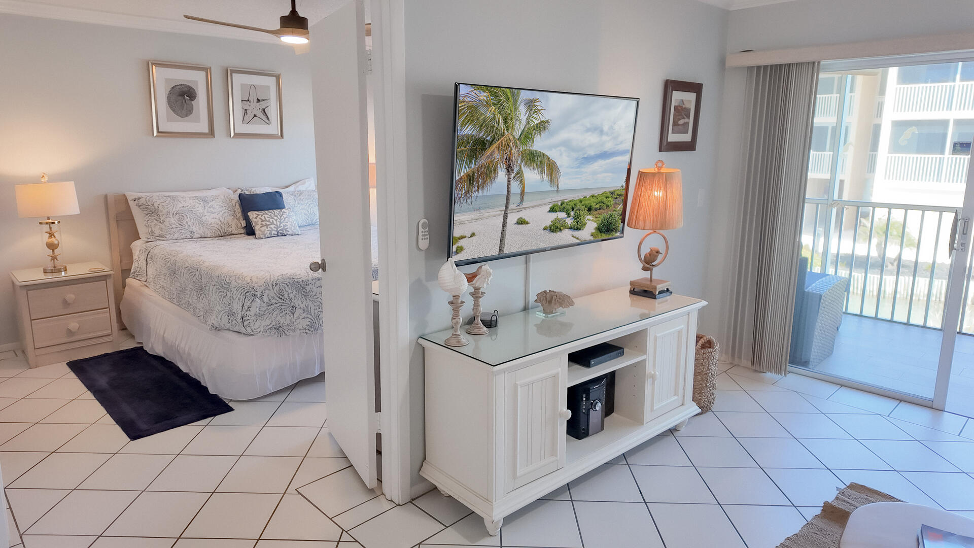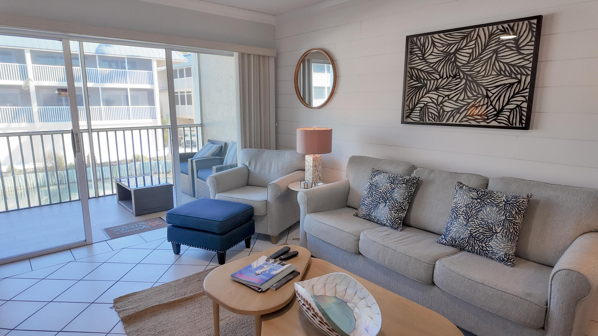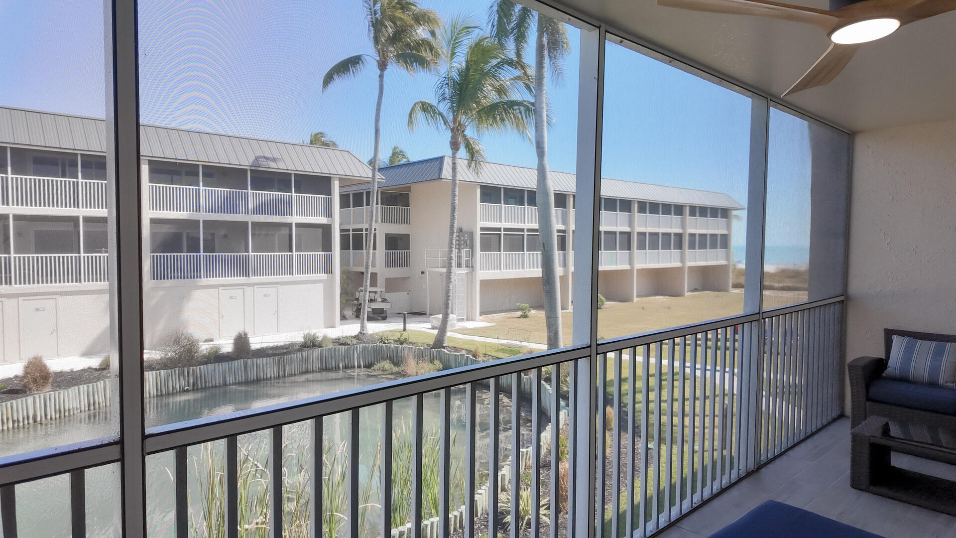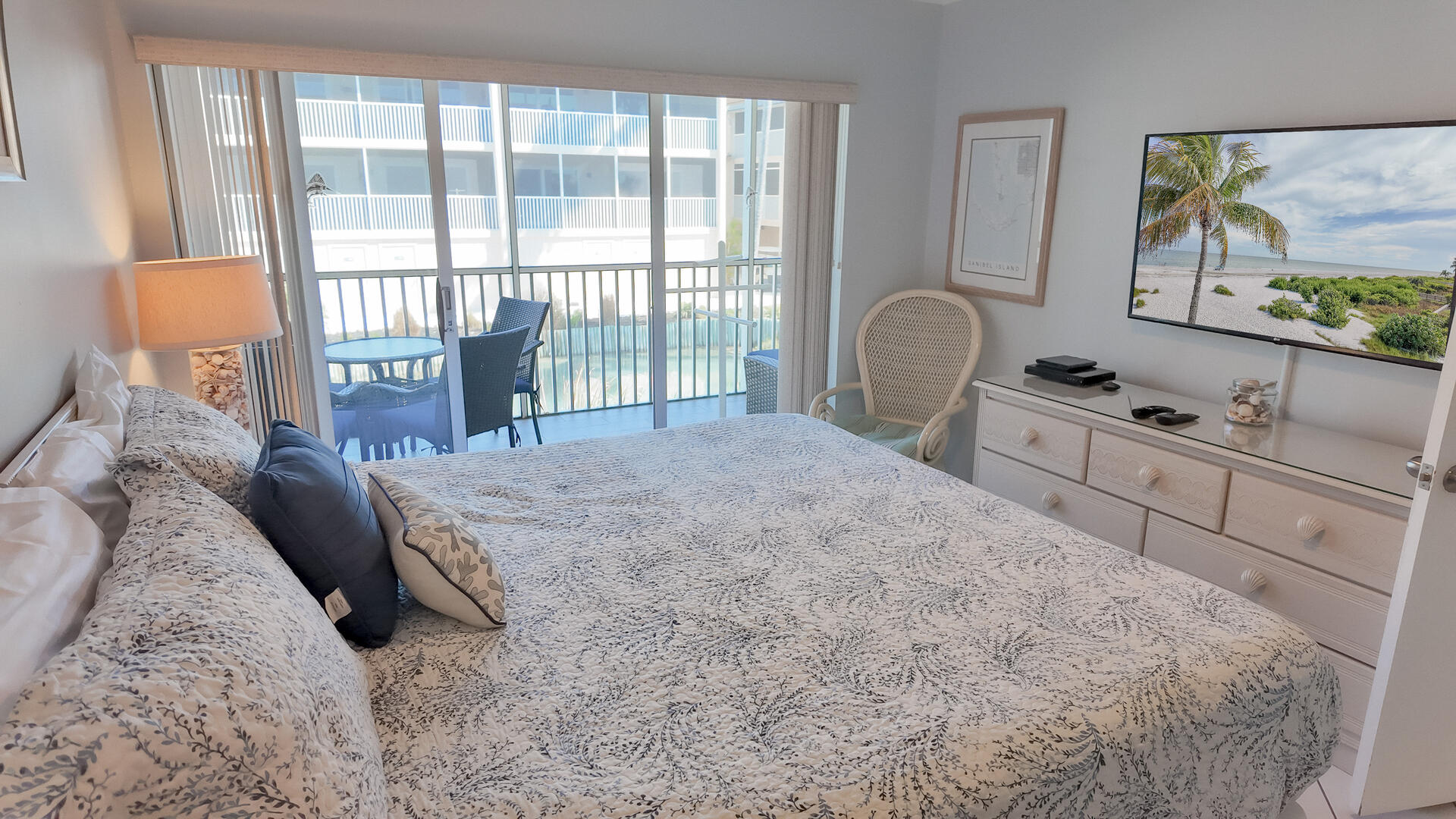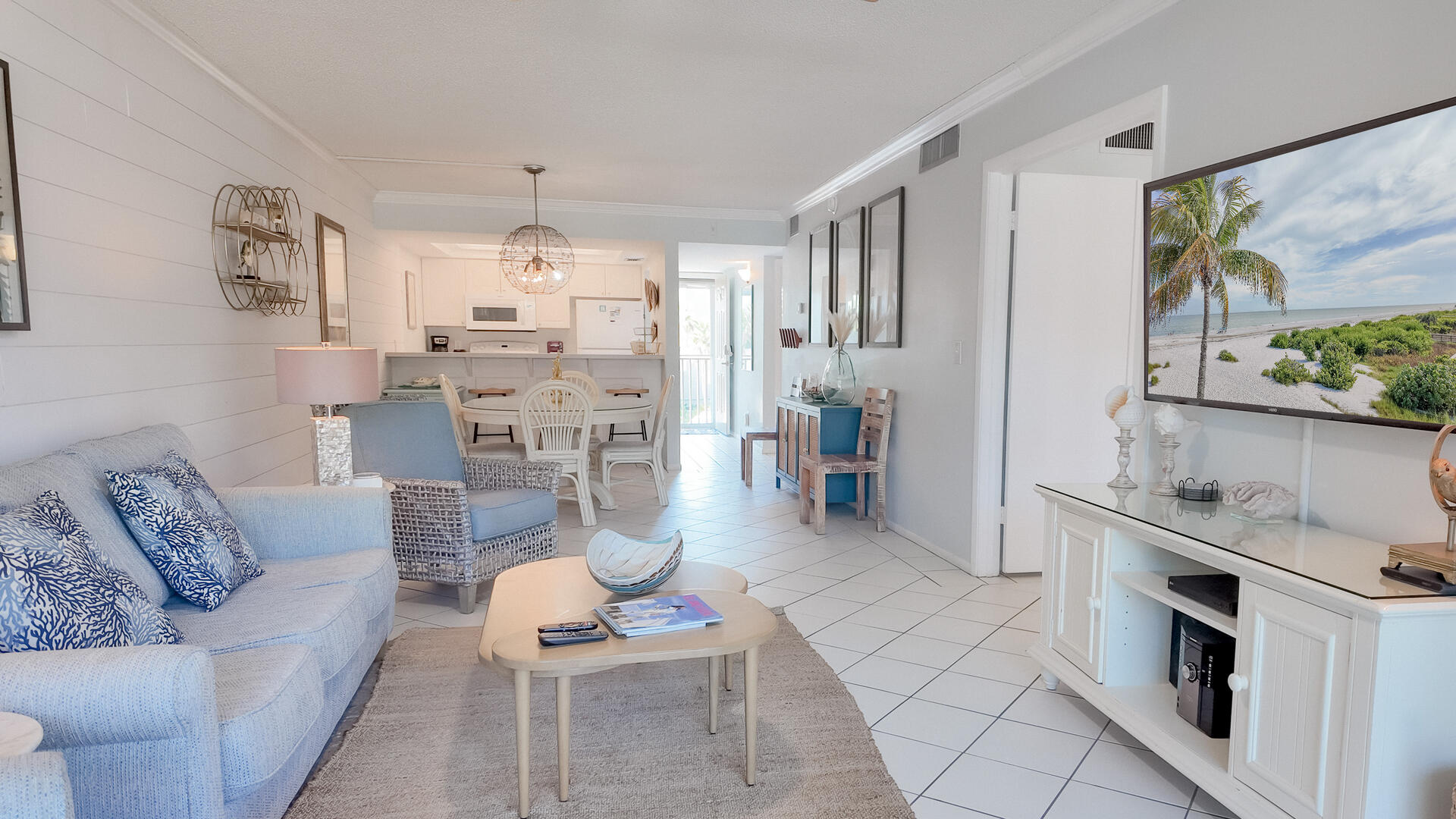 Sanibel Siesta on the Beach, Unit 403. The perfect place to stay for a memorable vacation! Look for starfish on the beach and gaze at the stars at night. Pretty and spacious 2 bed/2 bath non-smoking unit with a beachy theme is just steps to the beach or pool. Enjoy the artwork featuring local birds. The master suite has a king bed with access to a large screened lanai overlooking a tropical pond. The guest bedroom has twin beds but can be made into a king upon request. The large and bright living/dining room also opens onto the large screened lanai. The fully-equipped kitchen has everything you need to prepare a gourmet meal. The walk-in showers with safety bars, and the unit's close proximity to the elevator makes beach living a little easier. Other amenities include ceiling fans throughout, central air, 3 satellite flat-screen TVs, queen-size sleeper sofa, linens, and a starter pack of soaps, paper products and coffee. You will also enjoy your own private garage containing beach chairs, loungers and a beach umbrella for your convenience. Beach towels are available for rent or purchase from our on-site office. Sanibel Siesta offers tennis courts, heated swimming pool, Wifi, bike rentals, shuffleboard, gas grills and laundry facilities, all in a lush tropical setting with amazing sunsets! We are conveniently located within walking distance of a golf course and restaurants. Reservation pricing is based on a party of 4. A $30 daily fee will apply for any 5th or 6th person, a 1-time extra linen charge of $35.00 will apply. Max occupancy is 6 including children and infants. NO PETS.