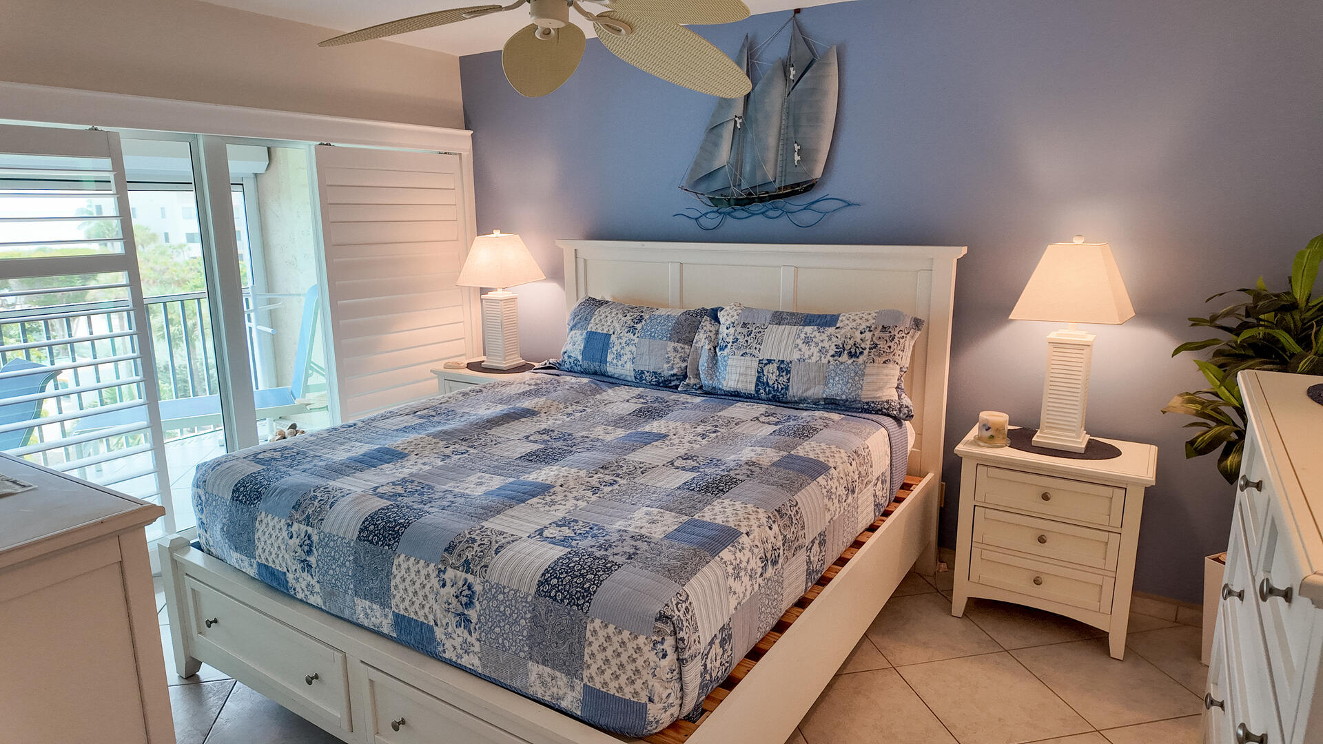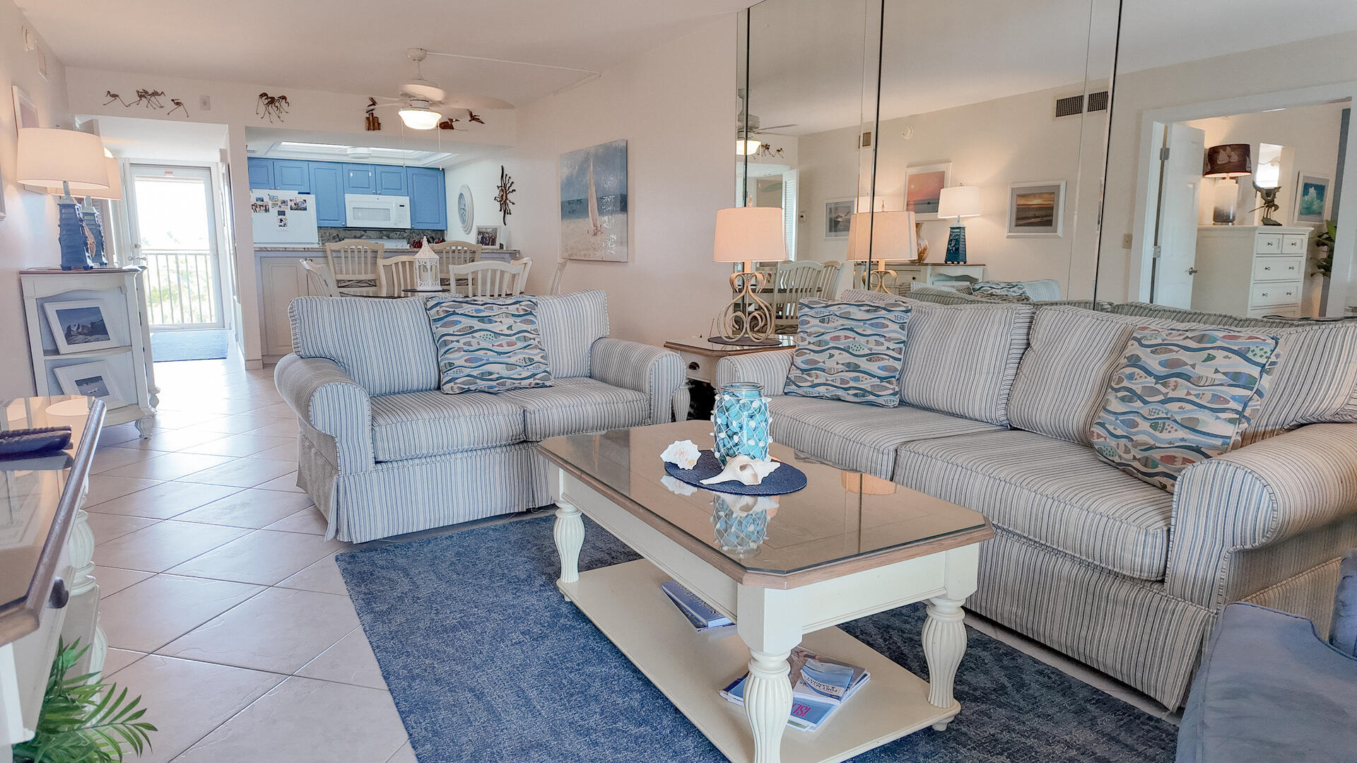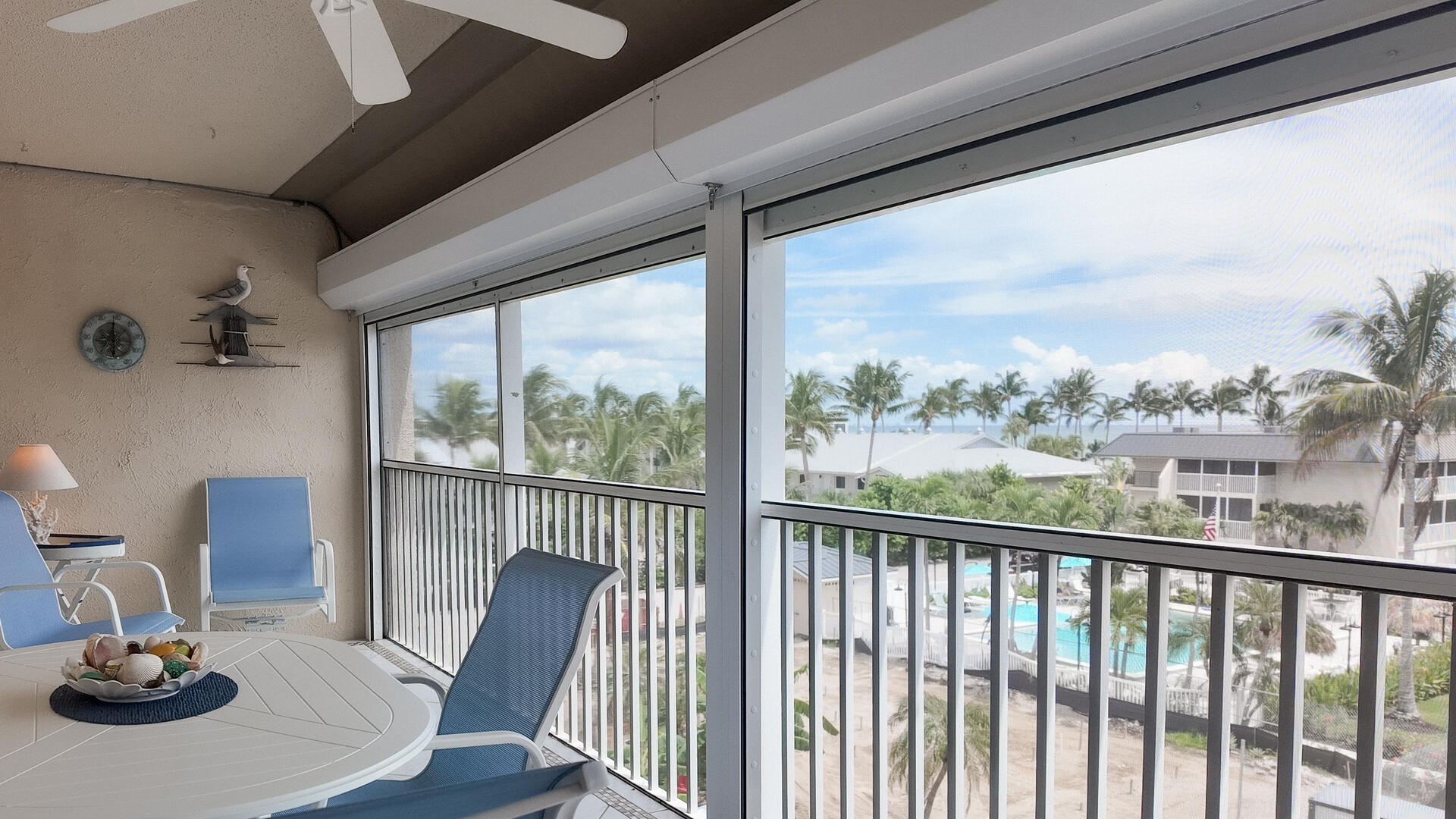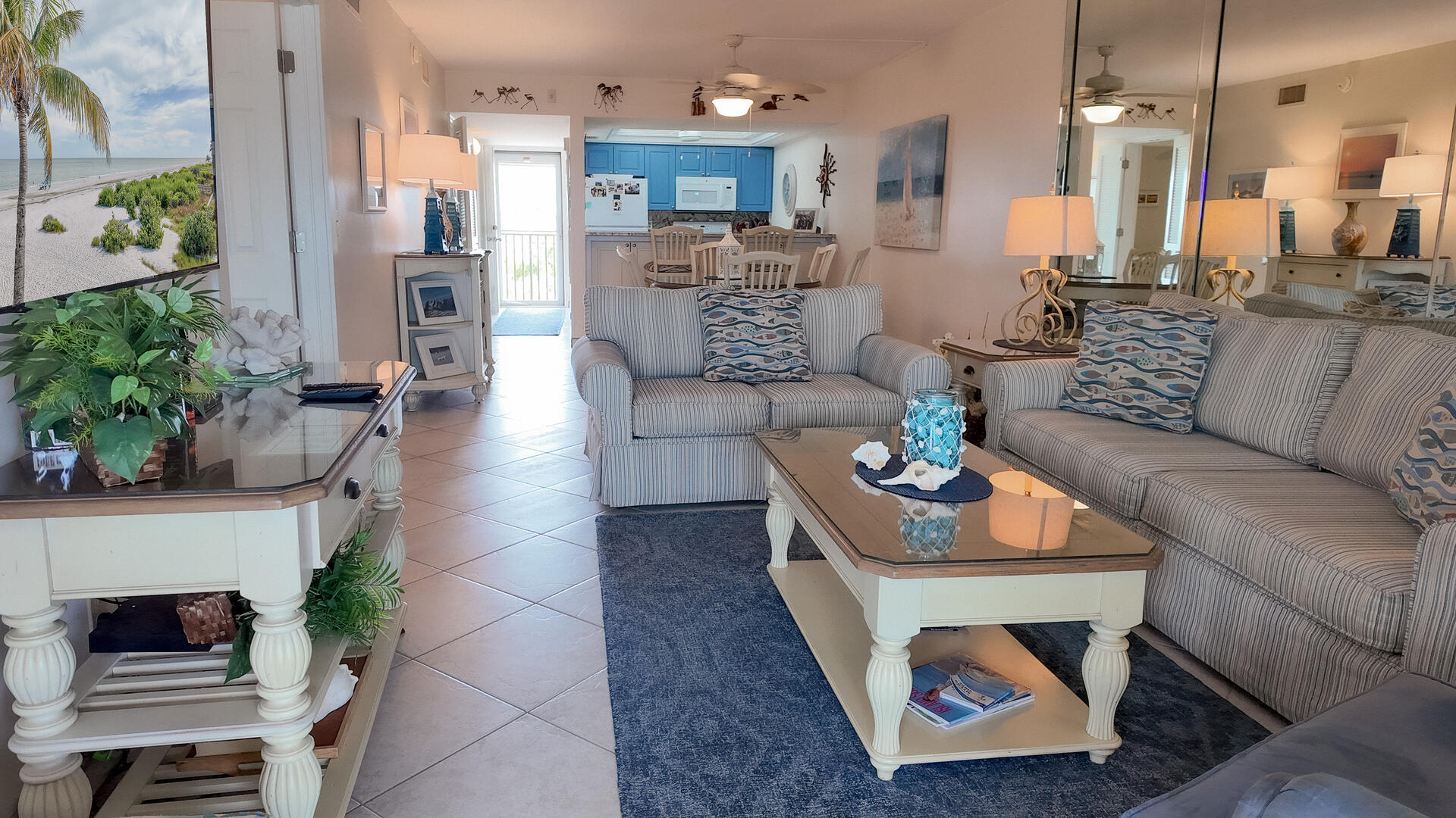 Sanibel Siesta on the Beach. Unit 211. Magnificent front view of the beautiful Gulf of Mexico from this 4th floor condo! This unit has a tropical theme with lots of little extras to make your stay special. This spacious 2 bed/2 bath non-smoking unit features all the comforts of home and is an easy walk to the beach and pool. The master suite has a king bed and access to a large screened lanai. The guest bedroom has doors which can connect to create an en suite. It also has twin beds but can be made into a king upon request. The fully equipped kitchen has everything you need to prepare a gourmet meal. Other amenities include ceiling fans throughout, central air, 3 satellite flat-screen TVs with DVD/VCR, linens and a starter pack of soaps, paper products and coffee. Beach chairs and a beach umbrella are provided for your convenience. Beach towels are available for rent or purchase from our on-site office. Sanibel Siesta offers tennis courts, heated swimming pool, WiFi, bike rentals, shuffleboard, gas grills, laundry facilities and elevators, all in a lush tropical setting with amazing sunsets! We are conveniently located within walking distance of a golf course and restaurants. Reservation pricing is based on a party of 4. A $30 daily fee will apply for any 5th or 6th person, a 1-time extra linen charge of $35.00 will apply. Max occupancy is 4 including children and infants. NO PETS.