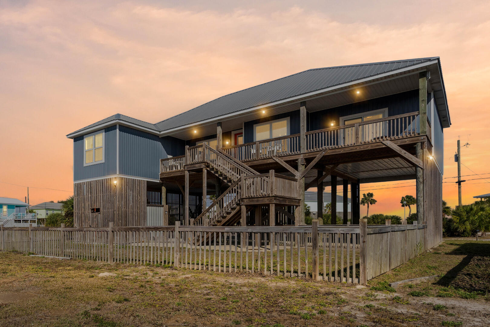 Shorely Unruffled (formally known as The Sandlot) is waiting for you where the vibes are easy, the breezes are warm and nothing ruffles your feathers unless you see a Pelican fighting a crab. Located in the center of the island, directly across the street from the newly constructed boardwalk that takes you over the protected dunes directly to the beach. You are literally minutes away from sticking your feet in the sand and walking the beach in either direction to search for the perfect seashell or cast a line to land a nice fish. Beach chairs, a wagon and more are provided in the downstairs storage at the house. There you will also find kayaks to enjoy on the bayside, a new gas grill or charcoal grill to use at your discretion. The central location also means you are less than a mile to shops and restaurants on the island. Venture upstairs where you will be amazed at the gulf view that can be enjoyed from any spot on the covered deck that runs the full width of the house. Bar height adirondack chairs make sure that the fence will not obstruct your views of the oil rigs out in the distance along with the shrimp boats that pass by while searching for their catch. On the bayside of the house you will find a sun deck that offers bar height adirondack chairs and a table along with great views of the bay, the bridge and sunrises that light up the morning sky. Once inside the living area offers a full sized leather couch and loveseat along with two leather swivel rocking recliners to relax on after your long day of exploring the island. A 60" flat screen streaming TV allows you to log into your favorite account to stream television shows or movies. Inside the cabinet under the television you'll find multiple games to enjoy in case you just want to stay in and enjoy the house. The kitchen offers marble countertops, all the appliances and cookware needed to make any meal you can dream up. The house offers a keurig coffee maker and a drip coffee maker can be found in the pantry. Seating for 4 on the island is complemented with additional seating for 8 at the dining room table just off the kitchen. The walk in pantry offers additional kitchen appliances for use (blenders, mixers etc) along with a full sized washer and dryer. The house offers four bedrooms and three bathrooms allowing ample space for your group to spread out. The master bedroom offers a king sized bed, dresser and large walk in closet. The ensuite master bath has dual marble vanities along with a walk in shower, soaking tub and private water closet. A sliding patio door off the master takes you right out to the main deck offering sweeping views of the Gulf. A second bedroom offers a queen sized bed, dresser and closet along with gulf views. A third bedroom offers two sets of bunk beds along with a dresser and closet. A fourth bedroom offers a queen sized bed, dresser and closet with bay views. All bedrooms offer flat screen TV's with streaming capabilities. There is a second full bath in the hallway between the second and third bedrooms and a third full bath connected to the third bedroom with access from the bedroom or just off the kitchen if you wanted to keep that access available. The home comfortably sleeps 10 with the inclusion of two rollaway beds that bring you availability to sleep up to 12. Come down to beautiful Dauphin Island, the Sunset Capital of Alabama and enjoy your time and become Shorely Unruffled. Things to know about our Dauphin Island Rentals: This listing has exterior cameras. Pet friendly with non-refundable pet deposit per pet. All linens are provided Charcoal grill provided You must be at least 25 years old to rent Additional Charges: Cleaning fee, 13% lodging tax, non-refundable reservation fee and damage waiver, optional travel insurance. Saturday to Saturday reservations preferred during peak summer season. ADSFR Fishing Rodeo weekly rentals only.